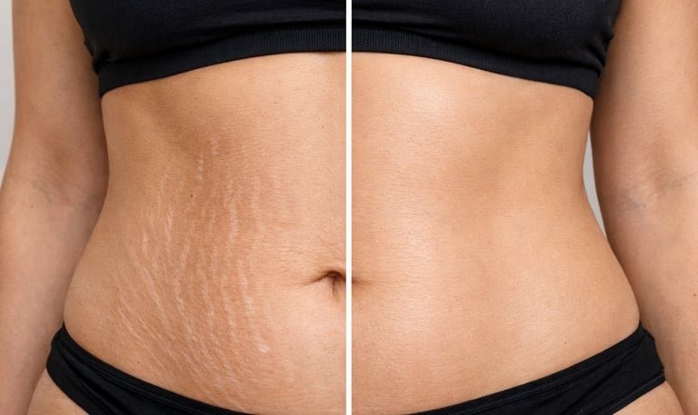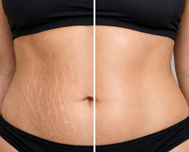 Para o Tratamento de Estrias, temos a associação de Laser CO2, Microagulhamento e Bioestimuladores reconstrói as fibras elásticas rompidas, melhorando significativamente a aparência das estrias brancas e vermelhas.