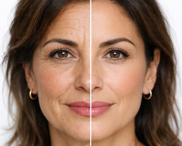 Controle Muscular com Toxina Botulínica, que é aplicada estrategicamente para relaxar a musculatura que causa rugas dinâmicas (testa, pés de galinha) e para prevenir a formação de vincos estáticos, mantendo a expressão leve e descansada.